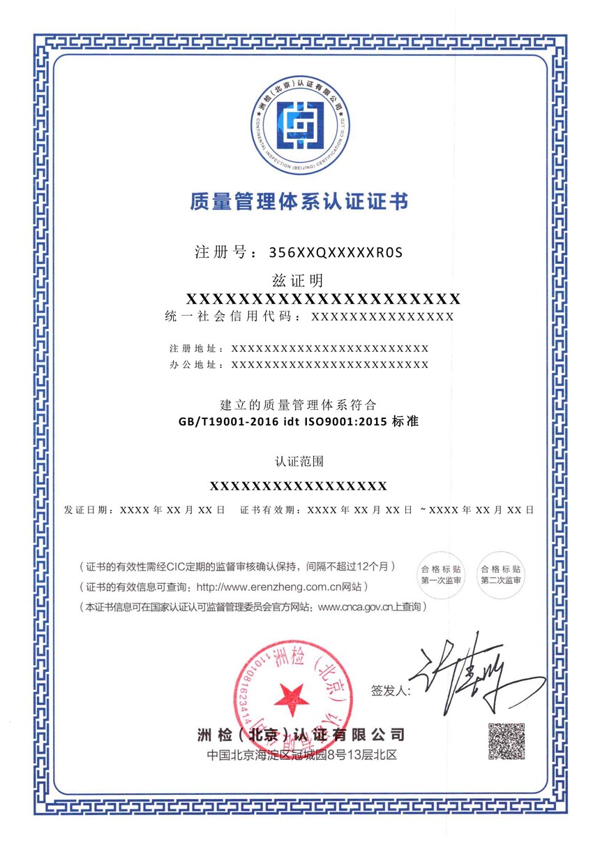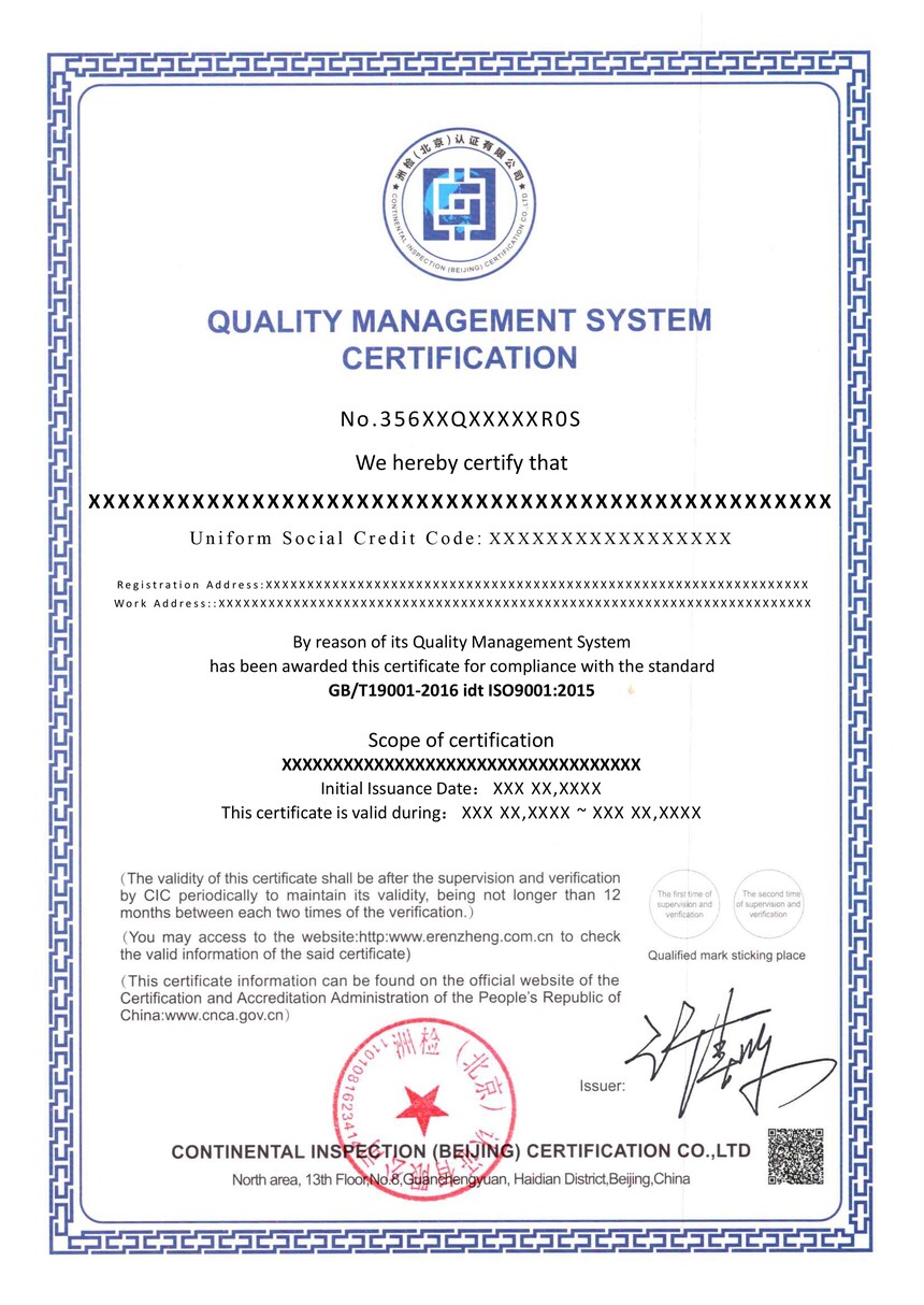 首頁 >> 證書樣本 >>證書樣本 >> 質量管理體系認證證書(中、英)